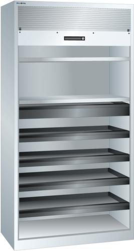 "longDescription": "LISTA Rollladenschrank, BxTxH: 1000x580x1950mm, Anzahl Verstellböden: 2 (60kg), 30mm stark, verzinkt, Anzahl Schubladen: 2x95mm (50kg), Anzahl Auszugböden: 3 (50kg), Schliessart: Schiebegriff-Zylinderschloss mit Wechselyzlinder inkl. 2 Schlüsseln mit Schlüsselnummer, Farbe Gehäuse/Schliessleiste: Reinweiss RAL 9010, Farbe Rollladen: aus PVC, ähnlich Lichtgrau RAL 7035, Farbe Schubladen/Auszugböden: Anthrazitgrau RAL 7016. Höchste Stabilität durch eine Gehäusetragkraft bis 500 kg. Sichere Verschliessbarkeit dank leichtgängigem Rollladen mit bedienerfreundlichem Schiebegriff und integriertem Zylinderschloss mit Wechselzylinder (weitere Schliesssysteme auf Anfrage). Höchster Bedienkomfort: Rollladen bleibt ohne Arretierung in jeder Höhe stehen. Allgemeine Vorteile der LISTA Schranksysteme<br>",
