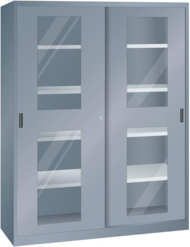 "longDescription": "LISTA Schiebetürschrank, BxTxH: 1500x500x1950mm, Anzahl Verstellböden: 8 (60kg), 30mm stark, verzinkt, Schliessart: Drehdruck-Zylinderschloss inkl. 2 Schlüsseln mit Schlüsselnummer, Ausstattung: Sichtfenster-Schiebetüren und Trennwand, Farbe Gehäuse: Grau metallic NCS S 6502-B, Farbe Türen: Grau metallic NCS S 6502-B. Höchste Stabilität durch eine Gehäusetragkraft von 500 kg bis 950 kg (ab Breite 1500 mm). Hohe Traglasten: 60 kg oder 100 kg pro Verstellboden, 50 kg pro Schublade/Auszugbogen. Perfekte Laufruhe dank hochwertiger, leichtgängiger und geräuscharmer Laufrollen der Schiebetüren. Allgemeine Vorteile der LISTA Schranksysteme<br>",