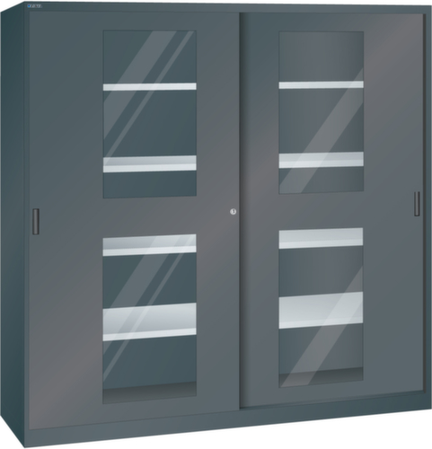 "longDescription": "LISTA Schiebetürschrank, BxTxH: 2000x400x1950mm, Anzahl Verstellböden: 8 (60kg), 30mm stark, verzinkt, Schliessart: Drehdruck-Zylinderschloss inkl. 2 Schlüsseln mit Schlüsselnummer, Ausstattung: Sichtfenster-Schiebetüren und Trennwand, Farbe Gehäuse: Schwarz NCS S 9000-N, Farbe Türen: Schwarz NCS S 9000-N. Höchste Stabilität durch eine Gehäusetragkraft von 500 kg bis 950 kg (ab Breite 1500 mm). Hohe Traglasten: 60 kg oder 100 kg pro Verstellboden, 50 kg pro Schublade/Auszugbogen. Perfekte Laufruhe dank hochwertiger, leichtgängiger und geräuscharmer Laufrollen der Schiebetüren. Allgemeine Vorteile der LISTA Schranksysteme<br>",