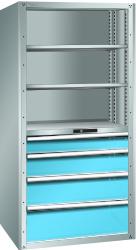 "longDescription": "LISTA Schubladenregal, Lista Einheit: 54x36E, BxTxH: 1117x706x2200mm, Schubladen-Nutzfläche BxT: 918x612mm, Ausstattung: Grundfeld mit 3 Universalböden, 2 Verstellböden (200kg), 2 Auszugböden (75kg), 4 Schubladen (150/200/250/300mm je 200kg),1 Rückwand, 2 Seitenwände, Farbe Gehäuse: Lichtgrau RAL 7035, Farbe Schubladen: Lichtblau RAL 5012. Höchste Stabilität durch robuste, stabile Bauweise mit bis zu 5,5 t Belastbarkeit pro Regalfeld. Ideal für grosses und schweres Lagergut bis 200 kg pro Schublade mit Auszugböden zur flächenbündigen Lagerung. Hervorragende Laufruhe durch traversenlos geführten Differenzialauszug. Jederzeit anpassbar an neues Lagergut durch den flexiblen Ein- und Umbau von Schubladen, Auszugböden und Verstellböden im 25-mm-Raster. Allgemeine Vorteile der LISTA-Schubladenschränke<br>",