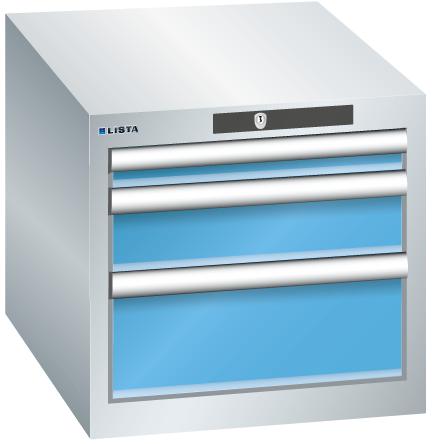 "longDescription": "LISTA Schubladenschrank, Lista Einheit: 18x27E, BxTxH: 411x572x383mm, Schubladen-Nutzfläche BxT: 306x459mm, Anzahl Schubladen: 3, Anzahl Fronthöhen (Tragkraft): 1x50mm (75kg), 1x100mm (75kg), 1x150mm (75kg), Schliessart: Key Lock, Standard-Schliessung mit Wechselyzlinder inkl. 2 Schlüsseln mit Schlüsselnummer, Farbe Gehäuse: Lichtgrau RAL 7035, Farbe Schubladen: Lichtblau RAL 5012. Höchste Stabilität: Gehäuse bis 4t belastbar, Schubladen mit 75 oder 200 kg Tragkraft. Maximale Ausnutzung dank Vollauszug und optimaler Mantelhöhe der Schubladen. Exzellente Schutzeigenschaften gegen Schmutz, Flüssigkeiten und mechanische Beanspruchung durch geschlossenes Gehäuse mit schlag- und abriebfester Oberfläche. Überzeugende Sicherheit: Aushebesicherung gegen Herausfallen der Schubladen und Einzelschubladensperre als Kippschutz. Korrosionsschutz durch Elektrophorese-Tauchlackierung und umweltfreundlichen Pulverlack. Optimale Ordnung und Organisation dank speziellem LISTA-Einteilungsmaterial für jeden Zweck und gelochter, geschlitzter Schubladen. Professionelle Beschriftung mit Beschriftungssoftware LISTA Script und hochklappbarer Griffleiste zum Einlegen der Etiketten. Perfekte Laufruhe durch traversenlos geführten Differenzialauszug. Flexible Anpassungsmöglichkeiten durch vorperforierte Löcher für Tischplatten (Punchout), Rollen, Schubladen, Schliesssysteme für einfaches Um- und Nachrüsten<br>",