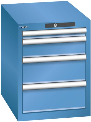 "longDescription": "LISTA Schubladenschrank, Lista Einheit: 18x27E, BxTxH: 411x572x533mm, Schubladen-Nutzfläche BxT: 306x459mm, Anzahl Schubladen: 4, Anzahl Fronthöhen (Tragkraft): 1x50mm (75kg), 1x100mm (75kg), 2x150mm (75kg), Schliessart: Key Lock, Standard-Schliessung mit Wechselyzlinder inkl. 2 Schlüsseln mit Schlüsselnummer, Farbe Gehäuse: Capriblau RAL 5019, Farbe Schubladen: Capriblau RAL 5019. Höchste Stabilität: Gehäuse bis 4t belastbar, Schubladen mit 75 oder 200 kg Tragkraft. Maximale Ausnutzung dank Vollauszug und optimaler Mantelhöhe der Schubladen. Exzellente Schutzeigenschaften gegen Schmutz, Flüssigkeiten und mechanische Beanspruchung durch geschlossenes Gehäuse mit schlag- und abriebfester Oberfläche. Überzeugende Sicherheit: Aushebesicherung gegen Herausfallen der Schubladen und Einzelschubladensperre als Kippschutz. Korrosionsschutz durch Elektrophorese-Tauchlackierung und umweltfreundlichen Pulverlack. Optimale Ordnung und Organisation dank speziellem LISTA-Einteilungsmaterial für jeden Zweck und gelochter, geschlitzter Schubladen. Professionelle Beschriftung mit Beschriftungssoftware LISTA Script und hochklappbarer Griffleiste zum Einlegen der Etiketten. Perfekte Laufruhe durch traversenlos geführten Differenzialauszug. Flexible Anpassungsmöglichkeiten durch vorperforierte Löcher für Tischplatten (Punchout), Rollen, Schubladen, Schliesssysteme für einfaches Um- und Nachrüsten<br>",