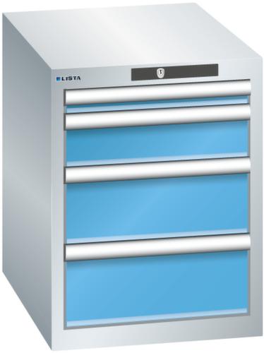 "longDescription": "LISTA Schubladenschrank, Lista Einheit: 18x27E, BxTxH: 411x572x533mm, Schubladen-Nutzfläche BxT: 306x459mm, Anzahl Schubladen: 4, Anzahl Fronthöhen (Tragkraft): 1x50mm (75kg), 1x100mm (75kg), 2x150mm (75kg), Schliessart: Key Lock, Standard-Schliessung mit Wechselyzlinder inkl. 2 Schlüsseln mit Schlüsselnummer, Farbe Gehäuse: Lichtgrau RAL 7035, Farbe Schubladen: Lichtblau RAL 5012. Höchste Stabilität: Gehäuse bis 4t belastbar, Schubladen mit 75 oder 200 kg Tragkraft. Maximale Ausnutzung dank Vollauszug und optimaler Mantelhöhe der Schubladen. Exzellente Schutzeigenschaften gegen Schmutz, Flüssigkeiten und mechanische Beanspruchung durch geschlossenes Gehäuse mit schlag- und abriebfester Oberfläche. Überzeugende Sicherheit: Aushebesicherung gegen Herausfallen der Schubladen und Einzelschubladensperre als Kippschutz. Korrosionsschutz durch Elektrophorese-Tauchlackierung und umweltfreundlichen Pulverlack. Optimale Ordnung und Organisation dank speziellem LISTA-Einteilungsmaterial für jeden Zweck und gelochter, geschlitzter Schubladen. Professionelle Beschriftung mit Beschriftungssoftware LISTA Script und hochklappbarer Griffleiste zum Einlegen der Etiketten. Perfekte Laufruhe durch traversenlos geführten Differenzialauszug. Flexible Anpassungsmöglichkeiten durch vorperforierte Löcher für Tischplatten (Punchout), Rollen, Schubladen, Schliesssysteme für einfaches Um- und Nachrüsten<br>",