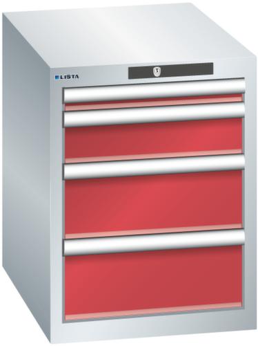 "longDescription": "LISTA Schubladenschrank, Lista Einheit: 18x27E, BxTxH: 411x572x533mm, Schubladen-Nutzfläche BxT: 306x459mm, Anzahl Schubladen: 4, Anzahl Fronthöhen (Tragkraft): 1x50mm (75kg), 1x100mm (75kg), 2x150mm (75kg), Schliessart: Key Lock, Standard-Schliessung mit Wechselyzlinder inkl. 2 Schlüsseln mit Schlüsselnummer, Farbe Gehäuse: Lichtgrau RAL 7035, Farbe Schubladen: Rubinrot RAL 3003. Höchste Stabilität: Gehäuse bis 4t belastbar, Schubladen mit 75 oder 200 kg Tragkraft. Maximale Ausnutzung dank Vollauszug und optimaler Mantelhöhe der Schubladen. Exzellente Schutzeigenschaften gegen Schmutz, Flüssigkeiten und mechanische Beanspruchung durch geschlossenes Gehäuse mit schlag- und abriebfester Oberfläche. Überzeugende Sicherheit: Aushebesicherung gegen Herausfallen der Schubladen und Einzelschubladensperre als Kippschutz. Korrosionsschutz durch Elektrophorese-Tauchlackierung und umweltfreundlichen Pulverlack. Optimale Ordnung und Organisation dank speziellem LISTA-Einteilungsmaterial für jeden Zweck und gelochter, geschlitzter Schubladen. Professionelle Beschriftung mit Beschriftungssoftware LISTA Script und hochklappbarer Griffleiste zum Einlegen der Etiketten. Perfekte Laufruhe durch traversenlos geführten Differenzialauszug. Flexible Anpassungsmöglichkeiten durch vorperforierte Löcher für Tischplatten (Punchout), Rollen, Schubladen, Schliesssysteme für einfaches Um- und Nachrüsten<br>",