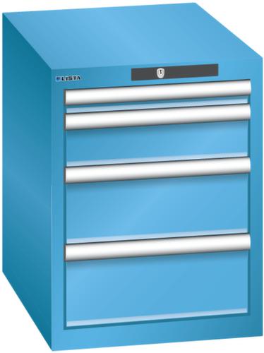 "longDescription": "LISTA Schubladenschrank, Lista Einheit: 18x27E, BxTxH: 411x572x533mm, Schubladen-Nutzfläche BxT: 306x459mm, Anzahl Schubladen: 4, Anzahl Fronthöhen (Tragkraft): 1x50mm (75kg), 1x100mm (75kg), 2x150mm (75kg), Schliessart: Code Lock, elektronisches Zahlenschloss mit 10 Ziffern für 4- bis 6-stellige Codes, bis 100 Codes, Farbe Gehäuse: Lichtblau RAL 5012, Farbe Schubladen: Lichtblau RAL 5012. Höchste Stabilität: Gehäuse bis 4t belastbar, Schubladen mit 75 oder 200 kg Tragkraft. Maximale Ausnutzung dank Vollauszug und optimaler Mantelhöhe der Schubladen. Exzellente Schutzeigenschaften gegen Schmutz, Flüssigkeiten und mechanische Beanspruchung durch geschlossenes Gehäuse mit schlag- und abriebfester Oberfläche. Überzeugende Sicherheit: Aushebesicherung gegen Herausfallen der Schubladen und Einzelschubladensperre als Kippschutz. Korrosionsschutz durch Elektrophorese-Tauchlackierung und umweltfreundlichen Pulverlack. Optimale Ordnung und Organisation dank speziellem LISTA-Einteilungsmaterial für jeden Zweck und gelochter, geschlitzter Schubladen. Professionelle Beschriftung mit Beschriftungssoftware LISTA Script und hochklappbarer Griffleiste zum Einlegen der Etiketten. Perfekte Laufruhe durch traversenlos geführten Differenzialauszug. Flexible Anpassungsmöglichkeiten durch vorperforierte Löcher für Tischplatten (Punchout), Rollen, Schubladen, Schliesssysteme für einfaches Um- und Nachrüsten<br>",