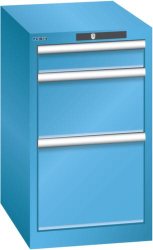 "longDescription": "LISTA Schubladenschrank, Lista Einheit: 18x27E, BxTxH: 411x572x700mm, Schubladen-Nutzfläche BxT: 306x459mm, Anzahl Schubladen: 3, Anzahl Fronthöhen (Tragkraft): 1x100mm (75kg), 1x200mm (75kg), 1x300mm (75kg), Schliessart: Key Lock, Standard-Schliessung mit Wechselyzlinder inkl. 2 Schlüsseln mit Schlüsselnummer, Farbe Gehäuse: Lichtblau RAL 5012, Farbe Schubladen: Lichtblau RAL 5012. Höchste Stabilität: Gehäuse bis 4t belastbar, Schubladen mit 75 oder 200 kg Tragkraft. Maximale Ausnutzung dank Vollauszug und optimaler Mantelhöhe der Schubladen. Exzellente Schutzeigenschaften gegen Schmutz, Flüssigkeiten und mechanische Beanspruchung durch geschlossenes Gehäuse mit schlag- und abriebfester Oberfläche. Überzeugende Sicherheit: Aushebesicherung gegen Herausfallen der Schubladen und Einzelschubladensperre als Kippschutz. Korrosionsschutz durch Elektrophorese-Tauchlackierung und umweltfreundlichen Pulverlack. Optimale Ordnung und Organisation dank speziellem LISTA-Einteilungsmaterial für jeden Zweck und gelochter, geschlitzter Schubladen. Professionelle Beschriftung mit Beschriftungssoftware LISTA Script und hochklappbarer Griffleiste zum Einlegen der Etiketten. Perfekte Laufruhe durch traversenlos geführten Differenzialauszug. Flexible Anpassungsmöglichkeiten durch vorperforierte Löcher für Tischplatten (Punchout), Rollen, Schubladen, Schliesssysteme für einfaches Um- und Nachrüsten<br>",