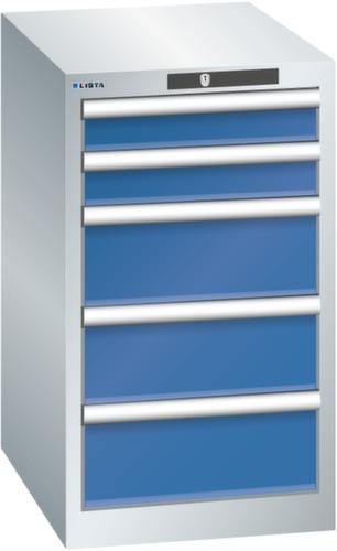 "longDescription": "LISTA Schubladenschrank, Lista Einheit: 18x27E, BxTxH: 411x572x700mm, Schubladen-Nutzfläche BxT: 306x459mm, Anzahl Schubladen: 5, Anzahl Fronthöhen (Tragkraft): 2x75mm (75kg), 3x150mm (75kg), Schliessart: Key Lock, Standard-Schliessung mit Wechselyzlinder inkl. 2 Schlüsseln mit Schlüsselnummer, Farbe Gehäuse: Lichtgrau RAL 7035, Farbe Schubladen: Signalblau RAL 5005. Höchste Stabilität: Gehäuse bis 4t belastbar, Schubladen mit 75 oder 200 kg Tragkraft. Maximale Ausnutzung dank Vollauszug und optimaler Mantelhöhe der Schubladen. Exzellente Schutzeigenschaften gegen Schmutz, Flüssigkeiten und mechanische Beanspruchung durch geschlossenes Gehäuse mit schlag- und abriebfester Oberfläche. Überzeugende Sicherheit: Aushebesicherung gegen Herausfallen der Schubladen und Einzelschubladensperre als Kippschutz. Korrosionsschutz durch Elektrophorese-Tauchlackierung und umweltfreundlichen Pulverlack. Optimale Ordnung und Organisation dank speziellem LISTA-Einteilungsmaterial für jeden Zweck und gelochter, geschlitzter Schubladen. Professionelle Beschriftung mit Beschriftungssoftware LISTA Script und hochklappbarer Griffleiste zum Einlegen der Etiketten. Perfekte Laufruhe durch traversenlos geführten Differenzialauszug. Flexible Anpassungsmöglichkeiten durch vorperforierte Löcher für Tischplatten (Punchout), Rollen, Schubladen, Schliesssysteme für einfaches Um- und Nachrüsten<br>",