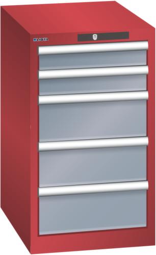 "longDescription": "LISTA Schubladenschrank, Lista Einheit: 18x27E, BxTxH: 411x572x700mm, Schubladen-Nutzfläche BxT: 306x459mm, Anzahl Schubladen: 5, Anzahl Fronthöhen (Tragkraft): 2x75mm (75kg), 3x150mm (75kg), Schliessart: Key Lock, Standard-Schliessung mit Wechselyzlinder inkl. 2 Schlüsseln mit Schlüsselnummer, Farbe Gehäuse: Rubinrot RAL 3003, Farbe Schubladen: Grau metallic NCS S 6502-B. Höchste Stabilität: Gehäuse bis 4t belastbar, Schubladen mit 75 oder 200 kg Tragkraft. Maximale Ausnutzung dank Vollauszug und optimaler Mantelhöhe der Schubladen. Exzellente Schutzeigenschaften gegen Schmutz, Flüssigkeiten und mechanische Beanspruchung durch geschlossenes Gehäuse mit schlag- und abriebfester Oberfläche. Überzeugende Sicherheit: Aushebesicherung gegen Herausfallen der Schubladen und Einzelschubladensperre als Kippschutz. Korrosionsschutz durch Elektrophorese-Tauchlackierung und umweltfreundlichen Pulverlack. Optimale Ordnung und Organisation dank speziellem LISTA-Einteilungsmaterial für jeden Zweck und gelochter, geschlitzter Schubladen. Professionelle Beschriftung mit Beschriftungssoftware LISTA Script und hochklappbarer Griffleiste zum Einlegen der Etiketten. Perfekte Laufruhe durch traversenlos geführten Differenzialauszug. Flexible Anpassungsmöglichkeiten durch vorperforierte Löcher für Tischplatten (Punchout), Rollen, Schubladen, Schliesssysteme für einfaches Um- und Nachrüsten<br>",