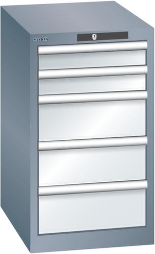 "longDescription": "LISTA Schubladenschrank, Lista Einheit: 18x27E, BxTxH: 411x572x700mm, Schubladen-Nutzfläche BxT: 306x459mm, Anzahl Schubladen: 5, Anzahl Fronthöhen (Tragkraft): 2x75mm (75kg), 3x150mm (75kg), Schliessart: Code Lock, elektronisches Zahlenschloss mit 10 Ziffern für 4- bis 6-stellige Codes, bis 100 Codes, Farbe Gehäuse: Grau metallic NCS S 6502-B, Farbe Schubladen: Lichtgrau RAL 7035. Höchste Stabilität: Gehäuse bis 4t belastbar, Schubladen mit 75 oder 200 kg Tragkraft. Maximale Ausnutzung dank Vollauszug und optimaler Mantelhöhe der Schubladen. Exzellente Schutzeigenschaften gegen Schmutz, Flüssigkeiten und mechanische Beanspruchung durch geschlossenes Gehäuse mit schlag- und abriebfester Oberfläche. Überzeugende Sicherheit: Aushebesicherung gegen Herausfallen der Schubladen und Einzelschubladensperre als Kippschutz. Korrosionsschutz durch Elektrophorese-Tauchlackierung und umweltfreundlichen Pulverlack. Optimale Ordnung und Organisation dank speziellem LISTA-Einteilungsmaterial für jeden Zweck und gelochter, geschlitzter Schubladen. Professionelle Beschriftung mit Beschriftungssoftware LISTA Script und hochklappbarer Griffleiste zum Einlegen der Etiketten. Perfekte Laufruhe durch traversenlos geführten Differenzialauszug. Flexible Anpassungsmöglichkeiten durch vorperforierte Löcher für Tischplatten (Punchout), Rollen, Schubladen, Schliesssysteme für einfaches Um- und Nachrüsten<br>",