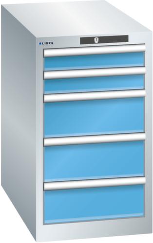 "longDescription": "LISTA Schubladenschrank, Lista Einheit: 18x36E, BxTxH: 411x725x700mm, Schubladen-Nutzfläche BxT: 306x612mm, Anzahl Schubladen: 5, Anzahl Fronthöhen (Tragkraft): 2x75mm (75kg), 3x150mm (75kg), Schliessart: Key Lock, Standard-Schliessung mit Wechselyzlinder inkl. 2 Schlüsseln mit Schlüsselnummer, Farbe Gehäuse: Lichtgrau RAL 7035, Farbe Schubladen: Lichtblau RAL 5012. Höchste Stabilität: Gehäuse bis 4t belastbar, Schubladen mit 75 oder 200 kg Tragkraft. Maximale Ausnutzung dank Vollauszug und optimaler Mantelhöhe der Schubladen. Exzellente Schutzeigenschaften gegen Schmutz, Flüssigkeiten und mechanische Beanspruchung durch geschlossenes Gehäuse mit schlag- und abriebfester Oberfläche. Überzeugende Sicherheit: Aushebesicherung gegen Herausfallen der Schubladen und Einzelschubladensperre als Kippschutz. Korrosionsschutz durch Elektrophorese-Tauchlackierung und umweltfreundlichen Pulverlack. Optimale Ordnung und Organisation dank speziellem LISTA-Einteilungsmaterial für jeden Zweck und gelochter, geschlitzter Schubladen. Professionelle Beschriftung mit Beschriftungssoftware LISTA Script und hochklappbarer Griffleiste zum Einlegen der Etiketten. Perfekte Laufruhe durch traversenlos geführten Differenzialauszug. Flexible Anpassungsmöglichkeiten durch vorperforierte Löcher für Tischplatten (Punchout), Rollen, Schubladen, Schliesssysteme für einfaches Um- und Nachrüsten<br>",