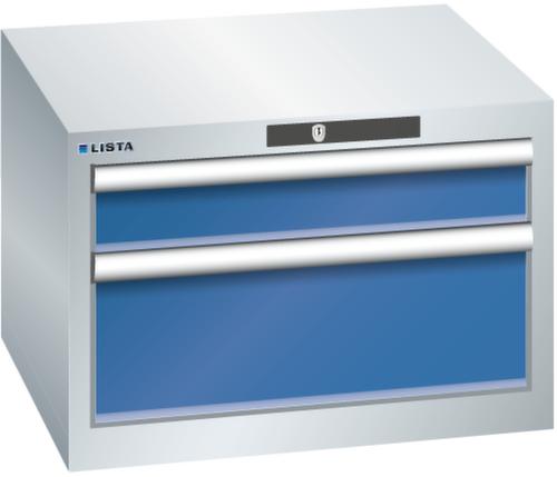 "longDescription": "LISTA Schubladenschrank, Lista Einheit: 27x27E, BxTxH: 564x572x383mm, Schubladen-Nutzfläche BxT: 459x459mm, Anzahl Schubladen: 2, Anzahl Fronthöhen (Tragkraft): 1x100mm (75kg), 1x200mm (75kg), Schliessart: Code Lock, elektronisches Zahlenschloss mit 10 Ziffern für 4- bis 6-stellige Codes, bis 100 Codes, Farbe Gehäuse: Lichtgrau RAL 7035, Farbe Schubladen: Signalblau RAL 5005. Höchste Stabilität: Gehäuse bis 4t belastbar, Schubladen mit 75 oder 200 kg Tragkraft. Maximale Ausnutzung dank Vollauszug und optimaler Mantelhöhe der Schubladen. Exzellente Schutzeigenschaften gegen Schmutz, Flüssigkeiten und mechanische Beanspruchung durch geschlossenes Gehäuse mit schlag- und abriebfester Oberfläche. Überzeugende Sicherheit: Aushebesicherung gegen Herausfallen der Schubladen und Einzelschubladensperre als Kippschutz. Korrosionsschutz durch Elektrophorese-Tauchlackierung und umweltfreundlichen Pulverlack. Optimale Ordnung und Organisation dank speziellem LISTA-Einteilungsmaterial für jeden Zweck und gelochter, geschlitzter Schubladen. Professionelle Beschriftung mit Beschriftungssoftware LISTA Script und hochklappbarer Griffleiste zum Einlegen der Etiketten. Perfekte Laufruhe durch traversenlos geführten Differenzialauszug. Flexible Anpassungsmöglichkeiten durch vorperforierte Löcher für Tischplatten (Punchout), Rollen, Schubladen, Schliesssysteme für einfaches Um- und Nachrüsten<br>",