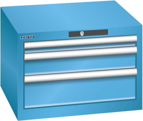 "longDescription": "LISTA Schubladenschrank, Lista Einheit: 27x27E, BxTxH: 564x572x383mm, Schubladen-Nutzfläche BxT: 459x459mm, Anzahl Schubladen: 3, Anzahl Fronthöhen (Tragkraft): 1x50mm (75kg), 1x100mm (75kg), 1x150mm (75kg), Schliessart: Code Lock, elektronisches Zahlenschloss mit 10 Ziffern für 4- bis 6-stellige Codes, bis 100 Codes, Farbe Gehäuse: Lichtblau RAL 5012, Farbe Schubladen: Lichtblau RAL 5012. Höchste Stabilität: Gehäuse bis 4t belastbar, Schubladen mit 75 oder 200 kg Tragkraft. Maximale Ausnutzung dank Vollauszug und optimaler Mantelhöhe der Schubladen. Exzellente Schutzeigenschaften gegen Schmutz, Flüssigkeiten und mechanische Beanspruchung durch geschlossenes Gehäuse mit schlag- und abriebfester Oberfläche. Überzeugende Sicherheit: Aushebesicherung gegen Herausfallen der Schubladen und Einzelschubladensperre als Kippschutz. Korrosionsschutz durch Elektrophorese-Tauchlackierung und umweltfreundlichen Pulverlack. Optimale Ordnung und Organisation dank speziellem LISTA-Einteilungsmaterial für jeden Zweck und gelochter, geschlitzter Schubladen. Professionelle Beschriftung mit Beschriftungssoftware LISTA Script und hochklappbarer Griffleiste zum Einlegen der Etiketten. Perfekte Laufruhe durch traversenlos geführten Differenzialauszug. Flexible Anpassungsmöglichkeiten durch vorperforierte Löcher für Tischplatten (Punchout), Rollen, Schubladen, Schliesssysteme für einfaches Um- und Nachrüsten<br>",