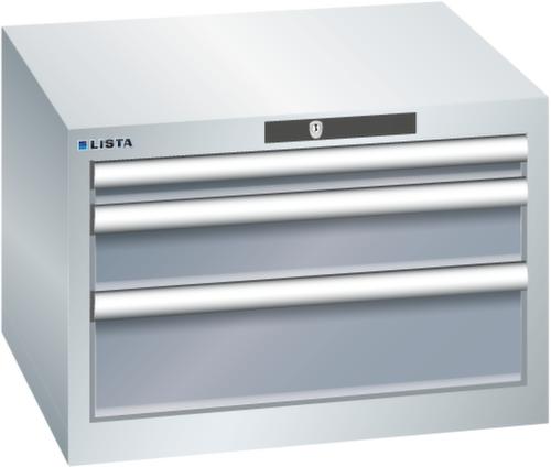 "longDescription": "LISTA Schubladenschrank, Lista Einheit: 27x27E, BxTxH: 564x572x383mm, Schubladen-Nutzfläche BxT: 459x459mm, Anzahl Schubladen: 3, Anzahl Fronthöhen (Tragkraft): 1x50mm (75kg), 1x100mm (75kg), 1x150mm (75kg), Schliessart: Code Lock, elektronisches Zahlenschloss mit 10 Ziffern für 4- bis 6-stellige Codes, bis 100 Codes, Farbe Gehäuse: Lichtgrau RAL 7035, Farbe Schubladen: Grau metallic NCS S 6502-B. Höchste Stabilität: Gehäuse bis 4t belastbar, Schubladen mit 75 oder 200 kg Tragkraft. Maximale Ausnutzung dank Vollauszug und optimaler Mantelhöhe der Schubladen. Exzellente Schutzeigenschaften gegen Schmutz, Flüssigkeiten und mechanische Beanspruchung durch geschlossenes Gehäuse mit schlag- und abriebfester Oberfläche. Überzeugende Sicherheit: Aushebesicherung gegen Herausfallen der Schubladen und Einzelschubladensperre als Kippschutz. Korrosionsschutz durch Elektrophorese-Tauchlackierung und umweltfreundlichen Pulverlack. Optimale Ordnung und Organisation dank speziellem LISTA-Einteilungsmaterial für jeden Zweck und gelochter, geschlitzter Schubladen. Professionelle Beschriftung mit Beschriftungssoftware LISTA Script und hochklappbarer Griffleiste zum Einlegen der Etiketten. Perfekte Laufruhe durch traversenlos geführten Differenzialauszug. Flexible Anpassungsmöglichkeiten durch vorperforierte Löcher für Tischplatten (Punchout), Rollen, Schubladen, Schliesssysteme für einfaches Um- und Nachrüsten<br>",