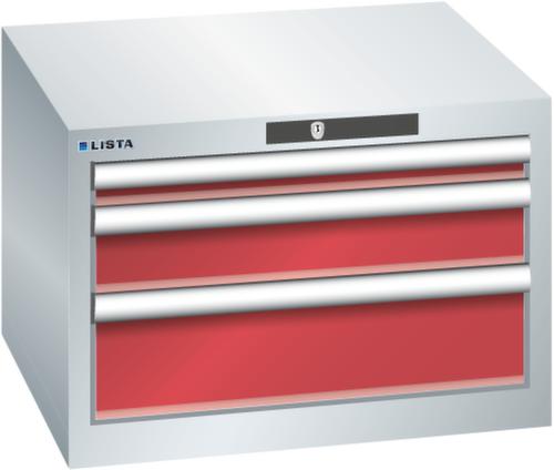 "longDescription": "LISTA Schubladenschrank, Lista Einheit: 27x27E, BxTxH: 564x572x383mm, Schubladen-Nutzfläche BxT: 459x459mm, Anzahl Schubladen: 3, Anzahl Fronthöhen (Tragkraft): 1x50mm (75kg), 1x100mm (75kg), 1x150mm (75kg), Schliessart: Code Lock, elektronisches Zahlenschloss mit 10 Ziffern für 4- bis 6-stellige Codes, bis 100 Codes, Farbe Gehäuse: Lichtgrau RAL 7035, Farbe Schubladen: Rubinrot RAL 3003. Höchste Stabilität: Gehäuse bis 4t belastbar, Schubladen mit 75 oder 200 kg Tragkraft. Maximale Ausnutzung dank Vollauszug und optimaler Mantelhöhe der Schubladen. Exzellente Schutzeigenschaften gegen Schmutz, Flüssigkeiten und mechanische Beanspruchung durch geschlossenes Gehäuse mit schlag- und abriebfester Oberfläche. Überzeugende Sicherheit: Aushebesicherung gegen Herausfallen der Schubladen und Einzelschubladensperre als Kippschutz. Korrosionsschutz durch Elektrophorese-Tauchlackierung und umweltfreundlichen Pulverlack. Optimale Ordnung und Organisation dank speziellem LISTA-Einteilungsmaterial für jeden Zweck und gelochter, geschlitzter Schubladen. Professionelle Beschriftung mit Beschriftungssoftware LISTA Script und hochklappbarer Griffleiste zum Einlegen der Etiketten. Perfekte Laufruhe durch traversenlos geführten Differenzialauszug. Flexible Anpassungsmöglichkeiten durch vorperforierte Löcher für Tischplatten (Punchout), Rollen, Schubladen, Schliesssysteme für einfaches Um- und Nachrüsten<br>",