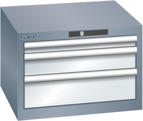 "longDescription": "LISTA Schubladenschrank, Lista Einheit: 27x27E, BxTxH: 564x572x383mm, Schubladen-Nutzfläche BxT: 459x459mm, Anzahl Schubladen: 3, Anzahl Fronthöhen (Tragkraft): 1x50mm (75kg), 1x100mm (75kg), 1x150mm (75kg), Schliessart: Code Lock, elektronisches Zahlenschloss mit 10 Ziffern für 4- bis 6-stellige Codes, bis 100 Codes, Farbe Gehäuse: Grau metallic NCS S 6502-B, Farbe Schubladen: Lichtgrau RAL 7035. Höchste Stabilität: Gehäuse bis 4t belastbar, Schubladen mit 75 oder 200 kg Tragkraft. Maximale Ausnutzung dank Vollauszug und optimaler Mantelhöhe der Schubladen. Exzellente Schutzeigenschaften gegen Schmutz, Flüssigkeiten und mechanische Beanspruchung durch geschlossenes Gehäuse mit schlag- und abriebfester Oberfläche. Überzeugende Sicherheit: Aushebesicherung gegen Herausfallen der Schubladen und Einzelschubladensperre als Kippschutz. Korrosionsschutz durch Elektrophorese-Tauchlackierung und umweltfreundlichen Pulverlack. Optimale Ordnung und Organisation dank speziellem LISTA-Einteilungsmaterial für jeden Zweck und gelochter, geschlitzter Schubladen. Professionelle Beschriftung mit Beschriftungssoftware LISTA Script und hochklappbarer Griffleiste zum Einlegen der Etiketten. Perfekte Laufruhe durch traversenlos geführten Differenzialauszug. Flexible Anpassungsmöglichkeiten durch vorperforierte Löcher für Tischplatten (Punchout), Rollen, Schubladen, Schliesssysteme für einfaches Um- und Nachrüsten<br>",