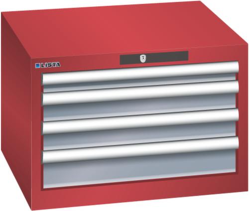 "longDescription": "LISTA Schubladenschrank, Lista Einheit: 27x27E, BxTxH: 564x572x383mm, Schubladen-Nutzfläche BxT: 459x459mm, Anzahl Schubladen: 4, Anzahl Fronthöhen (Tragkraft): 1x50mm (75kg), 2x75mm (75kg), 1x100mm (75kg), Schliessart: Code Lock, elektronisches Zahlenschloss mit 10 Ziffern für 4- bis 6-stellige Codes, bis 100 Codes, Farbe Gehäuse: Rubinrot RAL 3003, Farbe Schubladen: Grau metallic NCS S 6502-B. Höchste Stabilität: Gehäuse bis 4t belastbar, Schubladen mit 75 oder 200 kg Tragkraft. Maximale Ausnutzung dank Vollauszug und optimaler Mantelhöhe der Schubladen. Exzellente Schutzeigenschaften gegen Schmutz, Flüssigkeiten und mechanische Beanspruchung durch geschlossenes Gehäuse mit schlag- und abriebfester Oberfläche. Überzeugende Sicherheit: Aushebesicherung gegen Herausfallen der Schubladen und Einzelschubladensperre als Kippschutz. Korrosionsschutz durch Elektrophorese-Tauchlackierung und umweltfreundlichen Pulverlack. Optimale Ordnung und Organisation dank speziellem LISTA-Einteilungsmaterial für jeden Zweck und gelochter, geschlitzter Schubladen. Professionelle Beschriftung mit Beschriftungssoftware LISTA Script und hochklappbarer Griffleiste zum Einlegen der Etiketten. Perfekte Laufruhe durch traversenlos geführten Differenzialauszug. Flexible Anpassungsmöglichkeiten durch vorperforierte Löcher für Tischplatten (Punchout), Rollen, Schubladen, Schliesssysteme für einfaches Um- und Nachrüsten<br>",