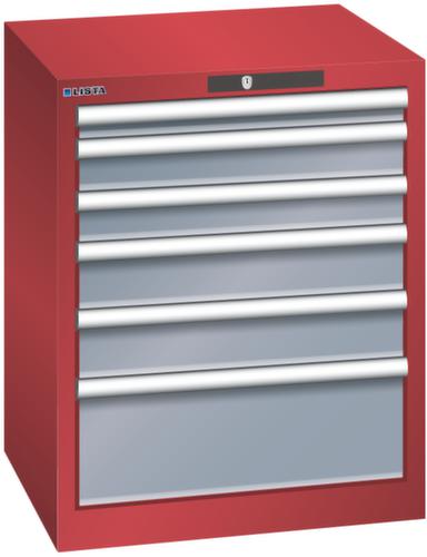 "longDescription": "LISTA Schubladenschrank, Lista Einheit: 27x27E, BxTxH: 564x572x700mm, Schubladen-Nutzfläche BxT: 459x459mm, Anzahl Schubladen: 6, Anzahl Fronthöhen (Tragkraft): 1x50mm (75kg), 2x75mm (75kg), 2x100mm (75kg), 1x200mm (75kg), Schliessart: Key Lock, Standard-Schliessung mit Wechselyzlinder inkl. 2 Schlüsseln mit Schlüsselnummer, Farbe Gehäuse: Rubinrot RAL 3003, Farbe Schubladen: Grau metallic NCS S 6502-B. Höchste Stabilität: Gehäuse bis 4t belastbar, Schubladen mit 75 oder 200 kg Tragkraft. Maximale Ausnutzung dank Vollauszug und optimaler Mantelhöhe der Schubladen. Exzellente Schutzeigenschaften gegen Schmutz, Flüssigkeiten und mechanische Beanspruchung durch geschlossenes Gehäuse mit schlag- und abriebfester Oberfläche. Überzeugende Sicherheit: Aushebesicherung gegen Herausfallen der Schubladen und Einzelschubladensperre als Kippschutz. Korrosionsschutz durch Elektrophorese-Tauchlackierung und umweltfreundlichen Pulverlack. Optimale Ordnung und Organisation dank speziellem LISTA-Einteilungsmaterial für jeden Zweck und gelochter, geschlitzter Schubladen. Professionelle Beschriftung mit Beschriftungssoftware LISTA Script und hochklappbarer Griffleiste zum Einlegen der Etiketten. Perfekte Laufruhe durch traversenlos geführten Differenzialauszug. Flexible Anpassungsmöglichkeiten durch vorperforierte Löcher für Tischplatten (Punchout), Rollen, Schubladen, Schliesssysteme für einfaches Um- und Nachrüsten<br>",
