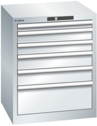 "longDescription": "LISTA Schubladenschrank, Lista Einheit: 27x27E, BxTxH: 564x572x700mm, Schubladen-Nutzfläche BxT: 459x459mm, Anzahl Schubladen: 6, Anzahl Fronthöhen (Tragkraft): 1x50mm (75kg), 2x75mm (75kg), 2x100mm (75kg), 1x200mm (75kg), Schliessart: Code Lock, elektronisches Zahlenschloss mit 10 Ziffern für 4- bis 6-stellige Codes, bis 100 Codes, Farbe Gehäuse: Lichtgrau RAL 7035, Farbe Schubladen: Lichtgrau RAL 7035. Höchste Stabilität: Gehäuse bis 4t belastbar, Schubladen mit 75 oder 200 kg Tragkraft. Maximale Ausnutzung dank Vollauszug und optimaler Mantelhöhe der Schubladen. Exzellente Schutzeigenschaften gegen Schmutz, Flüssigkeiten und mechanische Beanspruchung durch geschlossenes Gehäuse mit schlag- und abriebfester Oberfläche. Überzeugende Sicherheit: Aushebesicherung gegen Herausfallen der Schubladen und Einzelschubladensperre als Kippschutz. Korrosionsschutz durch Elektrophorese-Tauchlackierung und umweltfreundlichen Pulverlack. Optimale Ordnung und Organisation dank speziellem LISTA-Einteilungsmaterial für jeden Zweck und gelochter, geschlitzter Schubladen. Professionelle Beschriftung mit Beschriftungssoftware LISTA Script und hochklappbarer Griffleiste zum Einlegen der Etiketten. Perfekte Laufruhe durch traversenlos geführten Differenzialauszug. Flexible Anpassungsmöglichkeiten durch vorperforierte Löcher für Tischplatten (Punchout), Rollen, Schubladen, Schliesssysteme für einfaches Um- und Nachrüsten<br>",