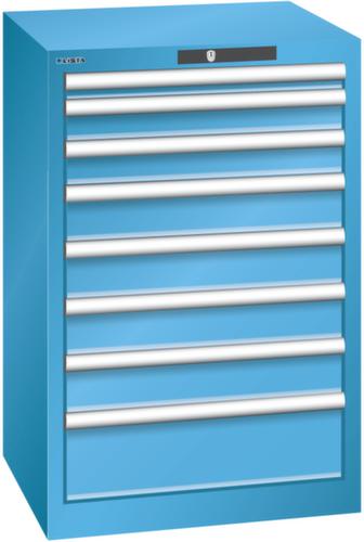"longDescription": "LISTA Schubladenschrank, Lista Einheit: 27x27E, BxTxH: 564x572x850mm, Schubladen-Nutzfläche BxT: 459x459mm, Anzahl Schubladen: 8, Anzahl Fronthöhen (Tragkraft): 1x 50mm (75kg), 2x 75mm (75kg), 4x100mm (75kg), 1x150mm (75kg), Schliessart: Key Lock, Standard-Schliessung mit Wechselyzlinder inkl. 2 Schlüsseln mit Schlüsselnummer, Farbe Gehäuse: Lichtblau RAL 5012, Farbe Schubladen: Lichtblau RAL 5012. Höchste Stabilität: Gehäuse bis 4t belastbar, Schubladen mit 75 oder 200 kg Tragkraft. Maximale Ausnutzung dank Vollauszug und optimaler Mantelhöhe der Schubladen. Exzellente Schutzeigenschaften gegen Schmutz, Flüssigkeiten und mechanische Beanspruchung durch geschlossenes Gehäuse mit schlag- und abriebfester Oberfläche. Überzeugende Sicherheit: Aushebesicherung gegen Herausfallen der Schubladen und Einzelschubladensperre als Kippschutz. Korrosionsschutz durch Elektrophorese-Tauchlackierung und umweltfreundlichen Pulverlack. Optimale Ordnung und Organisation dank speziellem LISTA-Einteilungsmaterial für jeden Zweck und gelochter, geschlitzter Schubladen. Professionelle Beschriftung mit Beschriftungssoftware LISTA Script und hochklappbarer Griffleiste zum Einlegen der Etiketten. Perfekte Laufruhe durch traversenlos geführten Differenzialauszug. Flexible Anpassungsmöglichkeiten durch vorperforierte Löcher für Tischplatten (Punchout), Rollen, Schubladen, Schliesssysteme für einfaches Um- und Nachrüsten<br>",
