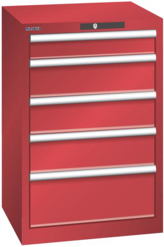 "longDescription": "LISTA Schubladenschrank, Lista Einheit: 27x27E, BxTxH: 564x572x850mm, Schubladen-Nutzfläche BxT: 459x459mm, Anzahl Schubladen: 5, Anzahl Fronthöhen (Tragkraft): 1x100mm (75kg), 3x150mm (75kg), 1x200mm (75kg), Schliessart: Code Lock, elektronisches Zahlenschloss mit 10 Ziffern für 4- bis 6-stellige Codes, bis 100 Codes, Farbe Gehäuse: Rubinrot RAL 3003, Farbe Schubladen: Rubinrot RAL 3003. Höchste Stabilität: Gehäuse bis 4t belastbar, Schubladen mit 75 oder 200 kg Tragkraft. Maximale Ausnutzung dank Vollauszug und optimaler Mantelhöhe der Schubladen. Exzellente Schutzeigenschaften gegen Schmutz, Flüssigkeiten und mechanische Beanspruchung durch geschlossenes Gehäuse mit schlag- und abriebfester Oberfläche. Überzeugende Sicherheit: Aushebesicherung gegen Herausfallen der Schubladen und Einzelschubladensperre als Kippschutz. Korrosionsschutz durch Elektrophorese-Tauchlackierung und umweltfreundlichen Pulverlack. Optimale Ordnung und Organisation dank speziellem LISTA-Einteilungsmaterial für jeden Zweck und gelochter, geschlitzter Schubladen. Professionelle Beschriftung mit Beschriftungssoftware LISTA Script und hochklappbarer Griffleiste zum Einlegen der Etiketten. Perfekte Laufruhe durch traversenlos geführten Differenzialauszug. Flexible Anpassungsmöglichkeiten durch vorperforierte Löcher für Tischplatten (Punchout), Rollen, Schubladen, Schliesssysteme für einfaches Um- und Nachrüsten<br>",