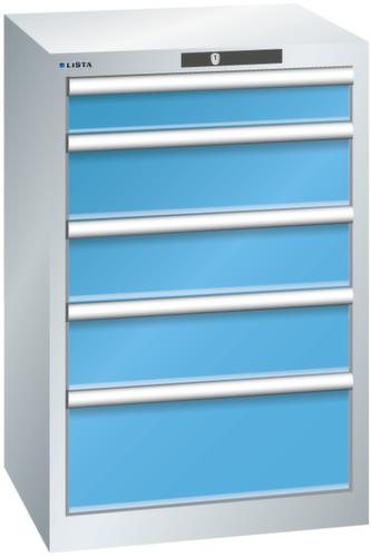 "longDescription": "LISTA Schubladenschrank, Lista Einheit: 27x27E, BxTxH: 564x572x850mm, Schubladen-Nutzfläche BxT: 459x459mm, Anzahl Schubladen: 5, Anzahl Fronthöhen (Tragkraft): 1x100mm (75kg), 3x150mm (75kg), 1x200mm (75kg), Schliessart: Code Lock, elektronisches Zahlenschloss mit 10 Ziffern für 4- bis 6-stellige Codes, bis 100 Codes, Farbe Gehäuse: Lichtgrau RAL 7035, Farbe Schubladen: Lichtblau RAL 5012. Höchste Stabilität: Gehäuse bis 4t belastbar, Schubladen mit 75 oder 200 kg Tragkraft. Maximale Ausnutzung dank Vollauszug und optimaler Mantelhöhe der Schubladen. Exzellente Schutzeigenschaften gegen Schmutz, Flüssigkeiten und mechanische Beanspruchung durch geschlossenes Gehäuse mit schlag- und abriebfester Oberfläche. Überzeugende Sicherheit: Aushebesicherung gegen Herausfallen der Schubladen und Einzelschubladensperre als Kippschutz. Korrosionsschutz durch Elektrophorese-Tauchlackierung und umweltfreundlichen Pulverlack. Optimale Ordnung und Organisation dank speziellem LISTA-Einteilungsmaterial für jeden Zweck und gelochter, geschlitzter Schubladen. Professionelle Beschriftung mit Beschriftungssoftware LISTA Script und hochklappbarer Griffleiste zum Einlegen der Etiketten. Perfekte Laufruhe durch traversenlos geführten Differenzialauszug. Flexible Anpassungsmöglichkeiten durch vorperforierte Löcher für Tischplatten (Punchout), Rollen, Schubladen, Schliesssysteme für einfaches Um- und Nachrüsten<br>",