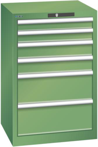 "longDescription": "LISTA Schubladenschrank, Lista Einheit: 27x27E, BxTxH: 564x572x850mm, Schubladen-Nutzfläche BxT: 459x459mm, Anzahl Schubladen: 6, Anzahl Fronthöhen (Tragkraft): 2x 75mm (75kg), 2x100mm (75kg), 2x200mm (75kg), Schliessart: Code Lock, elektronisches Zahlenschloss mit 10 Ziffern für 4- bis 6-stellige Codes, bis 100 Codes, Farbe Gehäuse: Resedagrün RAL 6011, Farbe Schubladen: Resedagrün RAL 6011. Höchste Stabilität: Gehäuse bis 4t belastbar, Schubladen mit 75 oder 200 kg Tragkraft. Maximale Ausnutzung dank Vollauszug und optimaler Mantelhöhe der Schubladen. Exzellente Schutzeigenschaften gegen Schmutz, Flüssigkeiten und mechanische Beanspruchung durch geschlossenes Gehäuse mit schlag- und abriebfester Oberfläche. Überzeugende Sicherheit: Aushebesicherung gegen Herausfallen der Schubladen und Einzelschubladensperre als Kippschutz. Korrosionsschutz durch Elektrophorese-Tauchlackierung und umweltfreundlichen Pulverlack. Optimale Ordnung und Organisation dank speziellem LISTA-Einteilungsmaterial für jeden Zweck und gelochter, geschlitzter Schubladen. Professionelle Beschriftung mit Beschriftungssoftware LISTA Script und hochklappbarer Griffleiste zum Einlegen der Etiketten. Perfekte Laufruhe durch traversenlos geführten Differenzialauszug. Flexible Anpassungsmöglichkeiten durch vorperforierte Löcher für Tischplatten (Punchout), Rollen, Schubladen, Schliesssysteme für einfaches Um- und Nachrüsten<br>",