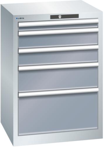 "longDescription": "LISTA Schubladenschrank, Lista Einheit: 27x27E, BxTxH: 564x572x800mm, Schubladen-Nutzfläche BxT: 459x459mm, Anzahl Schubladen: 5, Anzahl Fronthöhen (Tragkraft): 1x50mm (75kg), 2x100mm (75kg), 1x150mm (75kg), 1x300mm (75kg), Schliessart: Code Lock, elektronisches Zahlenschloss mit 10 Ziffern für 4- bis 6-stellige Codes, bis 100 Codes, Farbe Gehäuse: Lichtgrau RAL 7035, Farbe Schubladen: Grau metallic NCS S 6502-B. Höchste Stabilität: Gehäuse bis 4t belastbar, Schubladen mit 75 oder 200 kg Tragkraft. Maximale Ausnutzung dank Vollauszug und optimaler Mantelhöhe der Schubladen. Exzellente Schutzeigenschaften gegen Schmutz, Flüssigkeiten und mechanische Beanspruchung durch geschlossenes Gehäuse mit schlag- und abriebfester Oberfläche. Überzeugende Sicherheit: Aushebesicherung gegen Herausfallen der Schubladen und Einzelschubladensperre als Kippschutz. Korrosionsschutz durch Elektrophorese-Tauchlackierung und umweltfreundlichen Pulverlack. Optimale Ordnung und Organisation dank speziellem LISTA-Einteilungsmaterial für jeden Zweck und gelochter, geschlitzter Schubladen. Professionelle Beschriftung mit Beschriftungssoftware LISTA Script und hochklappbarer Griffleiste zum Einlegen der Etiketten. Perfekte Laufruhe durch traversenlos geführten Differenzialauszug. Flexible Anpassungsmöglichkeiten durch vorperforierte Löcher für Tischplatten (Punchout), Rollen, Schubladen, Schliesssysteme für einfaches Um- und Nachrüsten<br>",