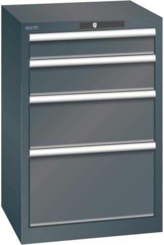 "longDescription": "LISTA Schubladenschrank, Lista Einheit: 27x27E, BxTxH: 564x572x850mm, Schubladen-Nutzfläche BxT: 459x459mm, Anzahl Schubladen: 4, Anzahl Fronthöhen (Tragkraft): 1x100mm (75kg), 1x150mm (75kg), 1x200mm (75kg), 1x300mm (75kg), Schliessart: Key Lock, Standard-Schliessung mit Wechselyzlinder inkl. 2 Schlüsseln mit Schlüsselnummer, Farbe Gehäuse: Schwarz NCS S 9000-N, Farbe Schubladen: Schwarz NCS S 9000-N. Höchste Stabilität: Gehäuse bis 4t belastbar, Schubladen mit 75 oder 200 kg Tragkraft. Maximale Ausnutzung dank Vollauszug und optimaler Mantelhöhe der Schubladen. Exzellente Schutzeigenschaften gegen Schmutz, Flüssigkeiten und mechanische Beanspruchung durch geschlossenes Gehäuse mit schlag- und abriebfester Oberfläche. Überzeugende Sicherheit: Aushebesicherung gegen Herausfallen der Schubladen und Einzelschubladensperre als Kippschutz. Korrosionsschutz durch Elektrophorese-Tauchlackierung und umweltfreundlichen Pulverlack. Optimale Ordnung und Organisation dank speziellem LISTA-Einteilungsmaterial für jeden Zweck und gelochter, geschlitzter Schubladen. Professionelle Beschriftung mit Beschriftungssoftware LISTA Script und hochklappbarer Griffleiste zum Einlegen der Etiketten. Perfekte Laufruhe durch traversenlos geführten Differenzialauszug. Flexible Anpassungsmöglichkeiten durch vorperforierte Löcher für Tischplatten (Punchout), Rollen, Schubladen, Schliesssysteme für einfaches Um- und Nachrüsten<br>",