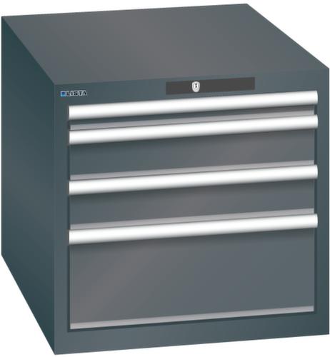"longDescription": "LISTA Schubladenschrank, Lista Einheit: 27x36E, BxTxH: 564x725x533mm, Schubladen-Nutzfläche BxT: 459x612mm, Anzahl Schubladen: 4, Anzahl Fronthöhen (Tragkraft): 1x 50mm (75kg), 2x100mm (75kg), 1x200mm (75kg), Schliessart: Key Lock, Standard-Schliessung mit Wechselyzlinder inkl. 2 Schlüsseln mit Schlüsselnummer, Farbe Gehäuse: Schwarz NCS S 9000-N, Farbe Schubladen: Schwarz NCS S 9000-N. Höchste Stabilität: Gehäuse bis 4t belastbar, Schubladen mit 75 oder 200 kg Tragkraft. Maximale Ausnutzung dank Vollauszug und optimaler Mantelhöhe der Schubladen. Exzellente Schutzeigenschaften gegen Schmutz, Flüssigkeiten und mechanische Beanspruchung durch geschlossenes Gehäuse mit schlag- und abriebfester Oberfläche. Überzeugende Sicherheit: Aushebesicherung gegen Herausfallen der Schubladen und Einzelschubladensperre als Kippschutz. Korrosionsschutz durch Elektrophorese-Tauchlackierung und umweltfreundlichen Pulverlack. Optimale Ordnung und Organisation dank speziellem LISTA-Einteilungsmaterial für jeden Zweck und gelochter, geschlitzter Schubladen. Professionelle Beschriftung mit Beschriftungssoftware LISTA Script und hochklappbarer Griffleiste zum Einlegen der Etiketten. Perfekte Laufruhe durch traversenlos geführten Differenzialauszug. Flexible Anpassungsmöglichkeiten durch vorperforierte Löcher für Tischplatten (Punchout), Rollen, Schubladen, Schliesssysteme für einfaches Um- und Nachrüsten<br>",