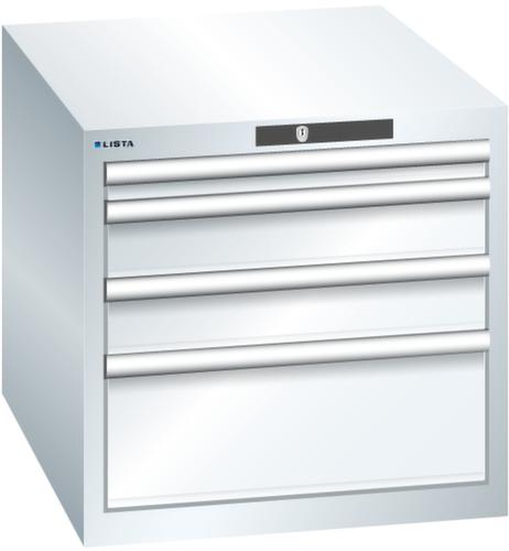 "longDescription": "LISTA Schubladenschrank, Lista Einheit: 27x36E, BxTxH: 564x725x533mm, Schubladen-Nutzfläche BxT: 459x612mm, Anzahl Schubladen: 4, Anzahl Fronthöhen (Tragkraft): 1x 50mm (75kg), 2x100mm (75kg), 1x200mm (75kg), Schliessart: Key Lock, Standard-Schliessung mit Wechselyzlinder inkl. 2 Schlüsseln mit Schlüsselnummer, Farbe Gehäuse: Reinweiss RAL 9010, Farbe Schubladen: Reinweiss RAL 9010. Höchste Stabilität: Gehäuse bis 4t belastbar, Schubladen mit 75 oder 200 kg Tragkraft. Maximale Ausnutzung dank Vollauszug und optimaler Mantelhöhe der Schubladen. Exzellente Schutzeigenschaften gegen Schmutz, Flüssigkeiten und mechanische Beanspruchung durch geschlossenes Gehäuse mit schlag- und abriebfester Oberfläche. Überzeugende Sicherheit: Aushebesicherung gegen Herausfallen der Schubladen und Einzelschubladensperre als Kippschutz. Korrosionsschutz durch Elektrophorese-Tauchlackierung und umweltfreundlichen Pulverlack. Optimale Ordnung und Organisation dank speziellem LISTA-Einteilungsmaterial für jeden Zweck und gelochter, geschlitzter Schubladen. Professionelle Beschriftung mit Beschriftungssoftware LISTA Script und hochklappbarer Griffleiste zum Einlegen der Etiketten. Perfekte Laufruhe durch traversenlos geführten Differenzialauszug. Flexible Anpassungsmöglichkeiten durch vorperforierte Löcher für Tischplatten (Punchout), Rollen, Schubladen, Schliesssysteme für einfaches Um- und Nachrüsten<br>",
