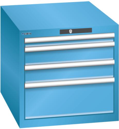 "longDescription": "LISTA Schubladenschrank, Lista Einheit: 27x36E, BxTxH: 564x725x533mm, Schubladen-Nutzfläche BxT: 459x612mm, Anzahl Schubladen: 4, Anzahl Fronthöhen (Tragkraft): 1x 50mm (75kg), 2x100mm (75kg), 1x200mm (75kg), Schliessart: Code Lock, elektronisches Zahlenschloss mit 10 Ziffern für 4- bis 6-stellige Codes, bis 100 Codes, Farbe Gehäuse: Lichtblau RAL 5012, Farbe Schubladen: Lichtblau RAL 5012. Höchste Stabilität: Gehäuse bis 4t belastbar, Schubladen mit 75 oder 200 kg Tragkraft. Maximale Ausnutzung dank Vollauszug und optimaler Mantelhöhe der Schubladen. Exzellente Schutzeigenschaften gegen Schmutz, Flüssigkeiten und mechanische Beanspruchung durch geschlossenes Gehäuse mit schlag- und abriebfester Oberfläche. Überzeugende Sicherheit: Aushebesicherung gegen Herausfallen der Schubladen und Einzelschubladensperre als Kippschutz. Korrosionsschutz durch Elektrophorese-Tauchlackierung und umweltfreundlichen Pulverlack. Optimale Ordnung und Organisation dank speziellem LISTA-Einteilungsmaterial für jeden Zweck und gelochter, geschlitzter Schubladen. Professionelle Beschriftung mit Beschriftungssoftware LISTA Script und hochklappbarer Griffleiste zum Einlegen der Etiketten. Perfekte Laufruhe durch traversenlos geführten Differenzialauszug. Flexible Anpassungsmöglichkeiten durch vorperforierte Löcher für Tischplatten (Punchout), Rollen, Schubladen, Schliesssysteme für einfaches Um- und Nachrüsten<br>",
