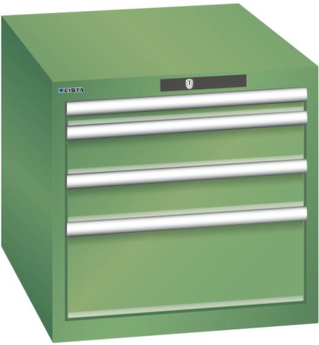 "longDescription": "LISTA Schubladenschrank, Lista Einheit: 27x36E, BxTxH: 564x725x533mm, Schubladen-Nutzfläche BxT: 459x612mm, Anzahl Schubladen: 4, Anzahl Fronthöhen (Tragkraft): 1x 50mm (75kg), 2x100mm (75kg), 1x200mm (75kg), Schliessart: Code Lock, elektronisches Zahlenschloss mit 10 Ziffern für 4- bis 6-stellige Codes, bis 100 Codes, Farbe Gehäuse: Resedagrün RAL 6011, Farbe Schubladen: Resedagrün RAL 6011. Höchste Stabilität: Gehäuse bis 4t belastbar, Schubladen mit 75 oder 200 kg Tragkraft. Maximale Ausnutzung dank Vollauszug und optimaler Mantelhöhe der Schubladen. Exzellente Schutzeigenschaften gegen Schmutz, Flüssigkeiten und mechanische Beanspruchung durch geschlossenes Gehäuse mit schlag- und abriebfester Oberfläche. Überzeugende Sicherheit: Aushebesicherung gegen Herausfallen der Schubladen und Einzelschubladensperre als Kippschutz. Korrosionsschutz durch Elektrophorese-Tauchlackierung und umweltfreundlichen Pulverlack. Optimale Ordnung und Organisation dank speziellem LISTA-Einteilungsmaterial für jeden Zweck und gelochter, geschlitzter Schubladen. Professionelle Beschriftung mit Beschriftungssoftware LISTA Script und hochklappbarer Griffleiste zum Einlegen der Etiketten. Perfekte Laufruhe durch traversenlos geführten Differenzialauszug. Flexible Anpassungsmöglichkeiten durch vorperforierte Löcher für Tischplatten (Punchout), Rollen, Schubladen, Schliesssysteme für einfaches Um- und Nachrüsten<br>",