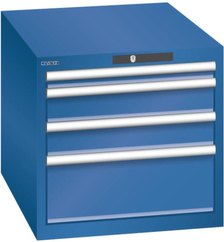 "longDescription": "LISTA Schubladenschrank, Lista Einheit: 27x36E, BxTxH: 564x725x533mm, Schubladen-Nutzfläche BxT: 459x612mm, Anzahl Schubladen: 4, Anzahl Fronthöhen (Tragkraft): 1x 50mm (75kg), 2x100mm (75kg), 1x200mm (75kg), Schliessart: Code Lock, elektronisches Zahlenschloss mit 10 Ziffern für 4- bis 6-stellige Codes, bis 100 Codes, Farbe Gehäuse: Enzianblau RAL 5010, Farbe Schubladen: Enzianblau RAL 5010. Höchste Stabilität: Gehäuse bis 4t belastbar, Schubladen mit 75 oder 200 kg Tragkraft. Maximale Ausnutzung dank Vollauszug und optimaler Mantelhöhe der Schubladen. Exzellente Schutzeigenschaften gegen Schmutz, Flüssigkeiten und mechanische Beanspruchung durch geschlossenes Gehäuse mit schlag- und abriebfester Oberfläche. Überzeugende Sicherheit: Aushebesicherung gegen Herausfallen der Schubladen und Einzelschubladensperre als Kippschutz. Korrosionsschutz durch Elektrophorese-Tauchlackierung und umweltfreundlichen Pulverlack. Optimale Ordnung und Organisation dank speziellem LISTA-Einteilungsmaterial für jeden Zweck und gelochter, geschlitzter Schubladen. Professionelle Beschriftung mit Beschriftungssoftware LISTA Script und hochklappbarer Griffleiste zum Einlegen der Etiketten. Perfekte Laufruhe durch traversenlos geführten Differenzialauszug. Flexible Anpassungsmöglichkeiten durch vorperforierte Löcher für Tischplatten (Punchout), Rollen, Schubladen, Schliesssysteme für einfaches Um- und Nachrüsten<br>",