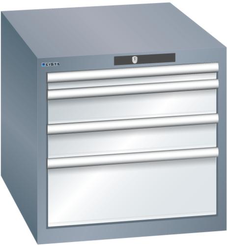 "longDescription": "LISTA Schubladenschrank, Lista Einheit: 27x36E, BxTxH: 564x725x533mm, Schubladen-Nutzfläche BxT: 459x612mm, Anzahl Schubladen: 4, Anzahl Fronthöhen (Tragkraft): 1x 50mm (75kg), 2x100mm (75kg), 1x200mm (75kg), Schliessart: Code Lock, elektronisches Zahlenschloss mit 10 Ziffern für 4- bis 6-stellige Codes, bis 100 Codes, Farbe Gehäuse: Grau metallic NCS S 6502-B, Farbe Schubladen: Lichtgrau RAL 7035. Höchste Stabilität: Gehäuse bis 4t belastbar, Schubladen mit 75 oder 200 kg Tragkraft. Maximale Ausnutzung dank Vollauszug und optimaler Mantelhöhe der Schubladen. Exzellente Schutzeigenschaften gegen Schmutz, Flüssigkeiten und mechanische Beanspruchung durch geschlossenes Gehäuse mit schlag- und abriebfester Oberfläche. Überzeugende Sicherheit: Aushebesicherung gegen Herausfallen der Schubladen und Einzelschubladensperre als Kippschutz. Korrosionsschutz durch Elektrophorese-Tauchlackierung und umweltfreundlichen Pulverlack. Optimale Ordnung und Organisation dank speziellem LISTA-Einteilungsmaterial für jeden Zweck und gelochter, geschlitzter Schubladen. Professionelle Beschriftung mit Beschriftungssoftware LISTA Script und hochklappbarer Griffleiste zum Einlegen der Etiketten. Perfekte Laufruhe durch traversenlos geführten Differenzialauszug. Flexible Anpassungsmöglichkeiten durch vorperforierte Löcher für Tischplatten (Punchout), Rollen, Schubladen, Schliesssysteme für einfaches Um- und Nachrüsten<br>",