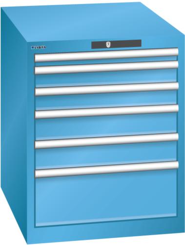 "longDescription": "LISTA Schubladenschrank, Lista Einheit: 27x36E, BxTxH: 564x725x700mm, Schubladen-Nutzfläche BxT: 459x612mm, Anzahl Schubladen: 6, Anzahl Fronthöhen (Tragkraft): 1x 50mm (75kg), 2x 75mm (75kg), 2x100mm (75kg), 1x200mm (75kg), Schliessart: Key Lock, Standard-Schliessung mit Wechselyzlinder inkl. 2 Schlüsseln mit Schlüsselnummer, Farbe Gehäuse: Lichtblau RAL 5012, Farbe Schubladen: Lichtblau RAL 5012. Höchste Stabilität: Gehäuse bis 4t belastbar, Schubladen mit 75 oder 200 kg Tragkraft. Maximale Ausnutzung dank Vollauszug und optimaler Mantelhöhe der Schubladen. Exzellente Schutzeigenschaften gegen Schmutz, Flüssigkeiten und mechanische Beanspruchung durch geschlossenes Gehäuse mit schlag- und abriebfester Oberfläche. Überzeugende Sicherheit: Aushebesicherung gegen Herausfallen der Schubladen und Einzelschubladensperre als Kippschutz. Korrosionsschutz durch Elektrophorese-Tauchlackierung und umweltfreundlichen Pulverlack. Optimale Ordnung und Organisation dank speziellem LISTA-Einteilungsmaterial für jeden Zweck und gelochter, geschlitzter Schubladen. Professionelle Beschriftung mit Beschriftungssoftware LISTA Script und hochklappbarer Griffleiste zum Einlegen der Etiketten. Perfekte Laufruhe durch traversenlos geführten Differenzialauszug. Flexible Anpassungsmöglichkeiten durch vorperforierte Löcher für Tischplatten (Punchout), Rollen, Schubladen, Schliesssysteme für einfaches Um- und Nachrüsten<br>",