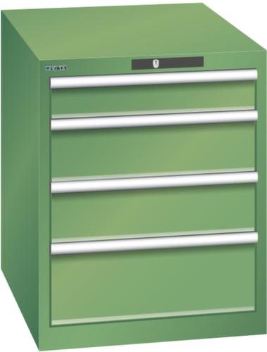 "longDescription": "LISTA Schubladenschrank, Lista Einheit: 27x36E, BxTxH: 564x725x700mm, Schubladen-Nutzfläche BxT: 459x612mm, Anzahl Schubladen: 4, Anzahl Fronthöhen (Tragkraft): 1x100mm (75kg), 2x150mm (75kg), 1x200mm (75kg), Schliessart: Code Lock, elektronisches Zahlenschloss mit 10 Ziffern für 4- bis 6-stellige Codes, bis 100 Codes, Farbe Gehäuse: Resedagrün RAL 6011, Farbe Schubladen: Resedagrün RAL 6011. Höchste Stabilität: Gehäuse bis 4t belastbar, Schubladen mit 75 oder 200 kg Tragkraft. Maximale Ausnutzung dank Vollauszug und optimaler Mantelhöhe der Schubladen. Exzellente Schutzeigenschaften gegen Schmutz, Flüssigkeiten und mechanische Beanspruchung durch geschlossenes Gehäuse mit schlag- und abriebfester Oberfläche. Überzeugende Sicherheit: Aushebesicherung gegen Herausfallen der Schubladen und Einzelschubladensperre als Kippschutz. Korrosionsschutz durch Elektrophorese-Tauchlackierung und umweltfreundlichen Pulverlack. Optimale Ordnung und Organisation dank speziellem LISTA-Einteilungsmaterial für jeden Zweck und gelochter, geschlitzter Schubladen. Professionelle Beschriftung mit Beschriftungssoftware LISTA Script und hochklappbarer Griffleiste zum Einlegen der Etiketten. Perfekte Laufruhe durch traversenlos geführten Differenzialauszug. Flexible Anpassungsmöglichkeiten durch vorperforierte Löcher für Tischplatten (Punchout), Rollen, Schubladen, Schliesssysteme für einfaches Um- und Nachrüsten<br>",