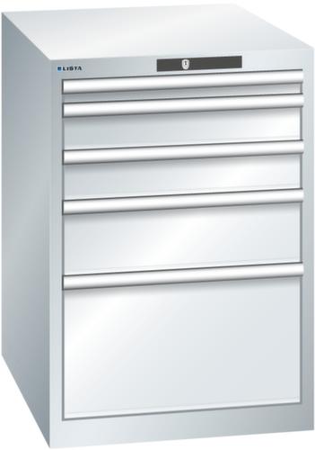 "longDescription": "LISTA Schubladenschrank, Lista Einheit: 27x36E, BxTxH: 564x725x800mm, Schubladen-Nutzfläche BxT: 459x612mm, Anzahl Schubladen: 5, Anzahl Fronthöhen (Tragkraft): 1x 50mm (75kg), 2x100mm (75kg), 1x150mm (75kg), 1x300mm (75kg), Schliessart: Key Lock, Standard-Schliessung mit Wechselyzlinder inkl. 2 Schlüsseln mit Schlüsselnummer, Farbe Gehäuse: Lichtgrau RAL 7035, Farbe Schubladen: Lichtgrau RAL 7035. Höchste Stabilität: Gehäuse bis 4t belastbar, Schubladen mit 75 oder 200 kg Tragkraft. Maximale Ausnutzung dank Vollauszug und optimaler Mantelhöhe der Schubladen. Exzellente Schutzeigenschaften gegen Schmutz, Flüssigkeiten und mechanische Beanspruchung durch geschlossenes Gehäuse mit schlag- und abriebfester Oberfläche. Überzeugende Sicherheit: Aushebesicherung gegen Herausfallen der Schubladen und Einzelschubladensperre als Kippschutz. Korrosionsschutz durch Elektrophorese-Tauchlackierung und umweltfreundlichen Pulverlack. Optimale Ordnung und Organisation dank speziellem LISTA-Einteilungsmaterial für jeden Zweck und gelochter, geschlitzter Schubladen. Professionelle Beschriftung mit Beschriftungssoftware LISTA Script und hochklappbarer Griffleiste zum Einlegen der Etiketten. Perfekte Laufruhe durch traversenlos geführten Differenzialauszug. Flexible Anpassungsmöglichkeiten durch vorperforierte Löcher für Tischplatten (Punchout), Rollen, Schubladen, Schliesssysteme für einfaches Um- und Nachrüsten<br>",