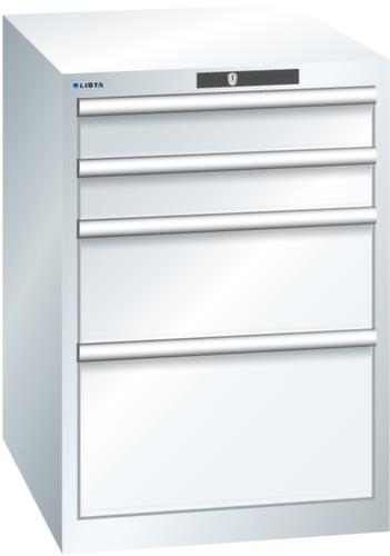 "longDescription": "LISTA Schubladenschrank, Lista Einheit: 27x36E, BxTxH: 564x725x800mm, Schubladen-Nutzfläche BxT: 459x612mm, Anzahl Schubladen: 4, Anzahl Fronthöhen (Tragkraft): 2x100mm (75kg), 1x200mm (75kg), 1x300mm (75kg), Schliessart: Code Lock, elektronisches Zahlenschloss mit 10 Ziffern für 4- bis 6-stellige Codes, bis 100 Codes, Farbe Gehäuse: Reinweiss RAL 9010, Farbe Schubladen: Reinweiss RAL 9010. Höchste Stabilität: Gehäuse bis 4t belastbar, Schubladen mit 75 oder 200 kg Tragkraft. Maximale Ausnutzung dank Vollauszug und optimaler Mantelhöhe der Schubladen. Exzellente Schutzeigenschaften gegen Schmutz, Flüssigkeiten und mechanische Beanspruchung durch geschlossenes Gehäuse mit schlag- und abriebfester Oberfläche. Überzeugende Sicherheit: Aushebesicherung gegen Herausfallen der Schubladen und Einzelschubladensperre als Kippschutz. Korrosionsschutz durch Elektrophorese-Tauchlackierung und umweltfreundlichen Pulverlack. Optimale Ordnung und Organisation dank speziellem LISTA-Einteilungsmaterial für jeden Zweck und gelochter, geschlitzter Schubladen. Professionelle Beschriftung mit Beschriftungssoftware LISTA Script und hochklappbarer Griffleiste zum Einlegen der Etiketten. Perfekte Laufruhe durch traversenlos geführten Differenzialauszug. Flexible Anpassungsmöglichkeiten durch vorperforierte Löcher für Tischplatten (Punchout), Rollen, Schubladen, Schliesssysteme für einfaches Um- und Nachrüsten<br>",