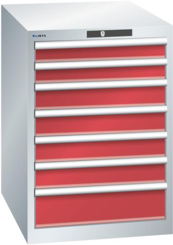 "longDescription": "LISTA Schubladenschrank, Lista Einheit: 27x36E, BxTxH: 564x725x800mm, Schubladen-Nutzfläche BxT: 459x612mm, Anzahl Schubladen: 7, Anzahl Fronthöhen (Tragkraft): 2x 75mm (75kg), 4x100mm (75kg), 1x150mm (75kg), Schliessart: Code Lock, elektronisches Zahlenschloss mit 10 Ziffern für 4- bis 6-stellige Codes, bis 100 Codes, Farbe Gehäuse: Lichtgrau RAL 7035, Farbe Schubladen: Rubinrot RAL 3003. Höchste Stabilität: Gehäuse bis 4t belastbar, Schubladen mit 75 oder 200 kg Tragkraft. Maximale Ausnutzung dank Vollauszug und optimaler Mantelhöhe der Schubladen. Exzellente Schutzeigenschaften gegen Schmutz, Flüssigkeiten und mechanische Beanspruchung durch geschlossenes Gehäuse mit schlag- und abriebfester Oberfläche. Überzeugende Sicherheit: Aushebesicherung gegen Herausfallen der Schubladen und Einzelschubladensperre als Kippschutz. Korrosionsschutz durch Elektrophorese-Tauchlackierung und umweltfreundlichen Pulverlack. Optimale Ordnung und Organisation dank speziellem LISTA-Einteilungsmaterial für jeden Zweck und gelochter, geschlitzter Schubladen. Professionelle Beschriftung mit Beschriftungssoftware LISTA Script und hochklappbarer Griffleiste zum Einlegen der Etiketten. Perfekte Laufruhe durch traversenlos geführten Differenzialauszug. Flexible Anpassungsmöglichkeiten durch vorperforierte Löcher für Tischplatten (Punchout), Rollen, Schubladen, Schliesssysteme für einfaches Um- und Nachrüsten<br>",