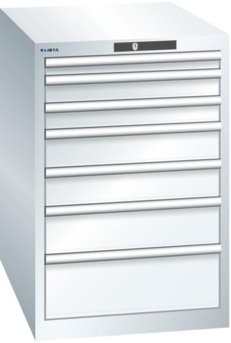 "longDescription": "LISTA Schubladenschrank, Lista Einheit: 27x36E, BxTxH: 564x725x850mm, Schubladen-Nutzfläche BxT: 459x612mm, Anzahl Schubladen: 7, Anzahl Fronthöhen (Tragkraft): 1x 50mm (75kg), 2x 75mm (75kg), 2x100mm (75kg), 1x150mm (75kg), 1x200mm (75kg), Schliessart: Key Lock, Standard-Schliessung mit Wechselyzlinder inkl. 2 Schlüsseln mit Schlüsselnummer, Farbe Gehäuse: Reinweiss RAL 9010, Farbe Schubladen: Reinweiss RAL 9010. Höchste Stabilität: Gehäuse bis 4t belastbar, Schubladen mit 75 oder 200 kg Tragkraft. Maximale Ausnutzung dank Vollauszug und optimaler Mantelhöhe der Schubladen. Exzellente Schutzeigenschaften gegen Schmutz, Flüssigkeiten und mechanische Beanspruchung durch geschlossenes Gehäuse mit schlag- und abriebfester Oberfläche. Überzeugende Sicherheit: Aushebesicherung gegen Herausfallen der Schubladen und Einzelschubladensperre als Kippschutz. Korrosionsschutz durch Elektrophorese-Tauchlackierung und umweltfreundlichen Pulverlack. Optimale Ordnung und Organisation dank speziellem LISTA-Einteilungsmaterial für jeden Zweck und gelochter, geschlitzter Schubladen. Professionelle Beschriftung mit Beschriftungssoftware LISTA Script und hochklappbarer Griffleiste zum Einlegen der Etiketten. Perfekte Laufruhe durch traversenlos geführten Differenzialauszug. Flexible Anpassungsmöglichkeiten durch vorperforierte Löcher für Tischplatten (Punchout), Rollen, Schubladen, Schliesssysteme für einfaches Um- und Nachrüsten<br>",