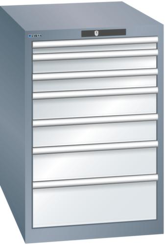 "longDescription": "LISTA Schubladenschrank, Lista Einheit: 27x36E, BxTxH: 564x725x850mm, Schubladen-Nutzfläche BxT: 459x612mm, Anzahl Schubladen: 7, Anzahl Fronthöhen (Tragkraft): 1x 50mm (75kg), 2x 75mm (75kg), 2x100mm (75kg), 1x150mm (75kg), 1x200mm (75kg), Schliessart: Code Lock, elektronisches Zahlenschloss mit 10 Ziffern für 4- bis 6-stellige Codes, bis 100 Codes, Farbe Gehäuse: Grau metallic NCS S 6502-B, Farbe Schubladen: Lichtgrau RAL 7035. Höchste Stabilität: Gehäuse bis 4t belastbar, Schubladen mit 75 oder 200 kg Tragkraft. Maximale Ausnutzung dank Vollauszug und optimaler Mantelhöhe der Schubladen. Exzellente Schutzeigenschaften gegen Schmutz, Flüssigkeiten und mechanische Beanspruchung durch geschlossenes Gehäuse mit schlag- und abriebfester Oberfläche. Überzeugende Sicherheit: Aushebesicherung gegen Herausfallen der Schubladen und Einzelschubladensperre als Kippschutz. Korrosionsschutz durch Elektrophorese-Tauchlackierung und umweltfreundlichen Pulverlack. Optimale Ordnung und Organisation dank speziellem LISTA-Einteilungsmaterial für jeden Zweck und gelochter, geschlitzter Schubladen. Professionelle Beschriftung mit Beschriftungssoftware LISTA Script und hochklappbarer Griffleiste zum Einlegen der Etiketten. Perfekte Laufruhe durch traversenlos geführten Differenzialauszug. Flexible Anpassungsmöglichkeiten durch vorperforierte Löcher für Tischplatten (Punchout), Rollen, Schubladen, Schliesssysteme für einfaches Um- und Nachrüsten<br>",