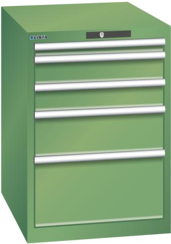 "longDescription": "LISTA Schubladenschrank, Lista Einheit: 27x36E, BxTxH: 564x725x850mm, Schubladen-Nutzfläche BxT: 459x612mm, Anzahl Schubladen: 5, Anzahl Fronthöhen (Tragkraft): 1x50mm (75kg), 2x 100mm (75kg), 1x200mm (75kg), 1x300mm (75kg), Schliessart: Key Lock, Standard-Schliessung mit Wechselyzlinder inkl. 2 Schlüsseln mit Schlüsselnummer, Farbe Gehäuse: Resedagrün RAL 6011, Farbe Schubladen: Resedagrün RAL 6011. Höchste Stabilität: Gehäuse bis 4t belastbar, Schubladen mit 75 oder 200 kg Tragkraft. Maximale Ausnutzung dank Vollauszug und optimaler Mantelhöhe der Schubladen. Exzellente Schutzeigenschaften gegen Schmutz, Flüssigkeiten und mechanische Beanspruchung durch geschlossenes Gehäuse mit schlag- und abriebfester Oberfläche. Überzeugende Sicherheit: Aushebesicherung gegen Herausfallen der Schubladen und Einzelschubladensperre als Kippschutz. Korrosionsschutz durch Elektrophorese-Tauchlackierung und umweltfreundlichen Pulverlack. Optimale Ordnung und Organisation dank speziellem LISTA-Einteilungsmaterial für jeden Zweck und gelochter, geschlitzter Schubladen. Professionelle Beschriftung mit Beschriftungssoftware LISTA Script und hochklappbarer Griffleiste zum Einlegen der Etiketten. Perfekte Laufruhe durch traversenlos geführten Differenzialauszug. Flexible Anpassungsmöglichkeiten durch vorperforierte Löcher für Tischplatten (Punchout), Rollen, Schubladen, Schliesssysteme für einfaches Um- und Nachrüsten<br>",