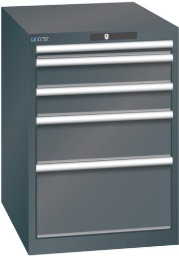 "longDescription": "LISTA Schubladenschrank, Lista Einheit: 27x36E, BxTxH: 564x725x850mm, Schubladen-Nutzfläche BxT: 459x612mm, Anzahl Schubladen: 5, Anzahl Fronthöhen (Tragkraft): 1x50mm (75kg), 2x 100mm (75kg), 1x200mm (75kg), 1x300mm (75kg), Schliessart: Key Lock, Standard-Schliessung mit Wechselyzlinder inkl. 2 Schlüsseln mit Schlüsselnummer, Farbe Gehäuse: Schwarz NCS S 9000-N, Farbe Schubladen: Schwarz NCS S 9000-N. Höchste Stabilität: Gehäuse bis 4t belastbar, Schubladen mit 75 oder 200 kg Tragkraft. Maximale Ausnutzung dank Vollauszug und optimaler Mantelhöhe der Schubladen. Exzellente Schutzeigenschaften gegen Schmutz, Flüssigkeiten und mechanische Beanspruchung durch geschlossenes Gehäuse mit schlag- und abriebfester Oberfläche. Überzeugende Sicherheit: Aushebesicherung gegen Herausfallen der Schubladen und Einzelschubladensperre als Kippschutz. Korrosionsschutz durch Elektrophorese-Tauchlackierung und umweltfreundlichen Pulverlack. Optimale Ordnung und Organisation dank speziellem LISTA-Einteilungsmaterial für jeden Zweck und gelochter, geschlitzter Schubladen. Professionelle Beschriftung mit Beschriftungssoftware LISTA Script und hochklappbarer Griffleiste zum Einlegen der Etiketten. Perfekte Laufruhe durch traversenlos geführten Differenzialauszug. Flexible Anpassungsmöglichkeiten durch vorperforierte Löcher für Tischplatten (Punchout), Rollen, Schubladen, Schliesssysteme für einfaches Um- und Nachrüsten<br>",