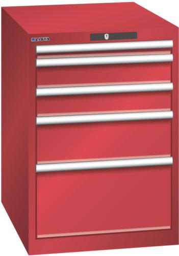 "longDescription": "LISTA Schubladenschrank, Lista Einheit: 27x36E, BxTxH: 564x725x850mm, Schubladen-Nutzfläche BxT: 459x612mm, Anzahl Schubladen: 5, Anzahl Fronthöhen (Tragkraft): 1x50mm (75kg), 2x 100mm (75kg), 1x200mm (75kg), 1x300mm (75kg), Schliessart: Code Lock, elektronisches Zahlenschloss mit 10 Ziffern für 4- bis 6-stellige Codes, bis 100 Codes, Farbe Gehäuse: Rubinrot RAL 3003, Farbe Schubladen: Rubinrot RAL 3003. Höchste Stabilität: Gehäuse bis 4t belastbar, Schubladen mit 75 oder 200 kg Tragkraft. Maximale Ausnutzung dank Vollauszug und optimaler Mantelhöhe der Schubladen. Exzellente Schutzeigenschaften gegen Schmutz, Flüssigkeiten und mechanische Beanspruchung durch geschlossenes Gehäuse mit schlag- und abriebfester Oberfläche. Überzeugende Sicherheit: Aushebesicherung gegen Herausfallen der Schubladen und Einzelschubladensperre als Kippschutz. Korrosionsschutz durch Elektrophorese-Tauchlackierung und umweltfreundlichen Pulverlack. Optimale Ordnung und Organisation dank speziellem LISTA-Einteilungsmaterial für jeden Zweck und gelochter, geschlitzter Schubladen. Professionelle Beschriftung mit Beschriftungssoftware LISTA Script und hochklappbarer Griffleiste zum Einlegen der Etiketten. Perfekte Laufruhe durch traversenlos geführten Differenzialauszug. Flexible Anpassungsmöglichkeiten durch vorperforierte Löcher für Tischplatten (Punchout), Rollen, Schubladen, Schliesssysteme für einfaches Um- und Nachrüsten<br>",