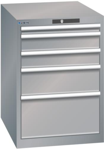 "longDescription": "LISTA Schubladenschrank, Lista Einheit: 27x36E, BxTxH: 564x725x850mm, Schubladen-Nutzfläche BxT: 459x612mm, Anzahl Schubladen: 5, Anzahl Fronthöhen (Tragkraft): 1x50mm (75kg), 2x 100mm (75kg), 1x200mm (75kg), 1x300mm (75kg), Schliessart: Code Lock, elektronisches Zahlenschloss mit 10 Ziffern für 4- bis 6-stellige Codes, bis 100 Codes, Farbe Gehäuse: Taubengrau NCS S 4502-B, Farbe Schubladen: Taubengrau NCS S 4502-B. Höchste Stabilität: Gehäuse bis 4t belastbar, Schubladen mit 75 oder 200 kg Tragkraft. Maximale Ausnutzung dank Vollauszug und optimaler Mantelhöhe der Schubladen. Exzellente Schutzeigenschaften gegen Schmutz, Flüssigkeiten und mechanische Beanspruchung durch geschlossenes Gehäuse mit schlag- und abriebfester Oberfläche. Überzeugende Sicherheit: Aushebesicherung gegen Herausfallen der Schubladen und Einzelschubladensperre als Kippschutz. Korrosionsschutz durch Elektrophorese-Tauchlackierung und umweltfreundlichen Pulverlack. Optimale Ordnung und Organisation dank speziellem LISTA-Einteilungsmaterial für jeden Zweck und gelochter, geschlitzter Schubladen. Professionelle Beschriftung mit Beschriftungssoftware LISTA Script und hochklappbarer Griffleiste zum Einlegen der Etiketten. Perfekte Laufruhe durch traversenlos geführten Differenzialauszug. Flexible Anpassungsmöglichkeiten durch vorperforierte Löcher für Tischplatten (Punchout), Rollen, Schubladen, Schliesssysteme für einfaches Um- und Nachrüsten<br>",