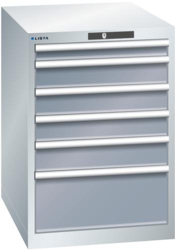 "longDescription": "LISTA Schubladenschrank, Lista Einheit: 27x36E, BxTxH: 564x725x850mm, Schubladen-Nutzfläche BxT: 459x612mm, Anzahl Schubladen: 6, Anzahl Fronthöhen (Tragkraft): 1x75mm (75kg), 3x100mm (75kg), 1x125mm (75kg), 1x250mm (75kg), Schliessart: Code Lock, elektronisches Zahlenschloss mit 10 Ziffern für 4- bis 6-stellige Codes, bis 100 Codes, Farbe Gehäuse: Lichtgrau RAL 7035, Farbe Schubladen: Grau metallic NCS S 6502-B. Höchste Stabilität: Gehäuse bis 4t belastbar, Schubladen mit 75 oder 200 kg Tragkraft. Maximale Ausnutzung dank Vollauszug und optimaler Mantelhöhe der Schubladen. Exzellente Schutzeigenschaften gegen Schmutz, Flüssigkeiten und mechanische Beanspruchung durch geschlossenes Gehäuse mit schlag- und abriebfester Oberfläche. Überzeugende Sicherheit: Aushebesicherung gegen Herausfallen der Schubladen und Einzelschubladensperre als Kippschutz. Korrosionsschutz durch Elektrophorese-Tauchlackierung und umweltfreundlichen Pulverlack. Optimale Ordnung und Organisation dank speziellem LISTA-Einteilungsmaterial für jeden Zweck und gelochter, geschlitzter Schubladen. Professionelle Beschriftung mit Beschriftungssoftware LISTA Script und hochklappbarer Griffleiste zum Einlegen der Etiketten. Perfekte Laufruhe durch traversenlos geführten Differenzialauszug. Flexible Anpassungsmöglichkeiten durch vorperforierte Löcher für Tischplatten (Punchout), Rollen, Schubladen, Schliesssysteme für einfaches Um- und Nachrüsten<br>",