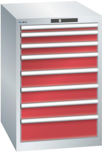 "longDescription": "LISTA Schubladenschrank, Lista Einheit: 27x36E, BxTxH: 564x725x850mm, Schubladen-Nutzfläche BxT: 459x612mm, Anzahl Schubladen: 8, Anzahl Fronthöhen (Tragkraft): 1x 50mm (75kg), 2x 75mm (75kg), 4x100mm (75kg), 1x150mm (75kg), Schliessart: Key Lock, Standard-Schliessung mit Wechselyzlinder inkl. 2 Schlüsseln mit Schlüsselnummer, Farbe Gehäuse: Lichtgrau RAL 7035, Farbe Schubladen: Rubinrot RAL 3003. Höchste Stabilität: Gehäuse bis 4t belastbar, Schubladen mit 75 oder 200 kg Tragkraft. Maximale Ausnutzung dank Vollauszug und optimaler Mantelhöhe der Schubladen. Exzellente Schutzeigenschaften gegen Schmutz, Flüssigkeiten und mechanische Beanspruchung durch geschlossenes Gehäuse mit schlag- und abriebfester Oberfläche. Überzeugende Sicherheit: Aushebesicherung gegen Herausfallen der Schubladen und Einzelschubladensperre als Kippschutz. Korrosionsschutz durch Elektrophorese-Tauchlackierung und umweltfreundlichen Pulverlack. Optimale Ordnung und Organisation dank speziellem LISTA-Einteilungsmaterial für jeden Zweck und gelochter, geschlitzter Schubladen. Professionelle Beschriftung mit Beschriftungssoftware LISTA Script und hochklappbarer Griffleiste zum Einlegen der Etiketten. Perfekte Laufruhe durch traversenlos geführten Differenzialauszug. Flexible Anpassungsmöglichkeiten durch vorperforierte Löcher für Tischplatten (Punchout), Rollen, Schubladen, Schliesssysteme für einfaches Um- und Nachrüsten<br>",