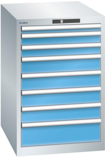 "longDescription": "LISTA Schubladenschrank, Lista Einheit: 27x36E, BxTxH: 564x725x850mm, Schubladen-Nutzfläche BxT: 459x612mm, Anzahl Schubladen: 8, Anzahl Fronthöhen (Tragkraft): 1x 50mm (75kg), 2x 75mm (75kg), 4x100mm (75kg), 1x150mm (75kg), Schliessart: Code Lock, elektronisches Zahlenschloss mit 10 Ziffern für 4- bis 6-stellige Codes, bis 100 Codes, Farbe Gehäuse: Lichtgrau RAL 7035, Farbe Schubladen: Lichtblau RAL 5012. Höchste Stabilität: Gehäuse bis 4t belastbar, Schubladen mit 75 oder 200 kg Tragkraft. Maximale Ausnutzung dank Vollauszug und optimaler Mantelhöhe der Schubladen. Exzellente Schutzeigenschaften gegen Schmutz, Flüssigkeiten und mechanische Beanspruchung durch geschlossenes Gehäuse mit schlag- und abriebfester Oberfläche. Überzeugende Sicherheit: Aushebesicherung gegen Herausfallen der Schubladen und Einzelschubladensperre als Kippschutz. Korrosionsschutz durch Elektrophorese-Tauchlackierung und umweltfreundlichen Pulverlack. Optimale Ordnung und Organisation dank speziellem LISTA-Einteilungsmaterial für jeden Zweck und gelochter, geschlitzter Schubladen. Professionelle Beschriftung mit Beschriftungssoftware LISTA Script und hochklappbarer Griffleiste zum Einlegen der Etiketten. Perfekte Laufruhe durch traversenlos geführten Differenzialauszug. Flexible Anpassungsmöglichkeiten durch vorperforierte Löcher für Tischplatten (Punchout), Rollen, Schubladen, Schliesssysteme für einfaches Um- und Nachrüsten<br>",