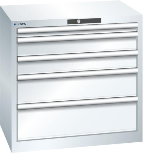 "longDescription": "LISTA Schubladenschrank, Lista Einheit: 36x27E, BxTxH: 717x572x700mm, Schubladen-Nutzfläche BxT: 612x459mm, Anzahl Schubladen: 5, Anzahl Fronthöhen (Tragkraft): 1x50mm (75kg), 2x100mm (75kg), 1x150mm (75kg), 1x200mm (75kg), Schliessart: Key Lock, Standard-Schliessung mit Wechselyzlinder inkl. 2 Schlüsseln mit Schlüsselnummer, Farbe Gehäuse: Reinweiss RAL 9010, Farbe Schubladen: Reinweiss RAL 9010. Höchste Stabilität: Gehäuse bis 4t belastbar, Schubladen mit 75 oder 200 kg Tragkraft. Maximale Ausnutzung dank Vollauszug und optimaler Mantelhöhe der Schubladen. Exzellente Schutzeigenschaften gegen Schmutz, Flüssigkeiten und mechanische Beanspruchung durch geschlossenes Gehäuse mit schlag- und abriebfester Oberfläche. Überzeugende Sicherheit: Aushebesicherung gegen Herausfallen der Schubladen und Einzelschubladensperre als Kippschutz. Korrosionsschutz durch Elektrophorese-Tauchlackierung und umweltfreundlichen Pulverlack. Optimale Ordnung und Organisation dank speziellem LISTA-Einteilungsmaterial für jeden Zweck und gelochter, geschlitzter Schubladen. Professionelle Beschriftung mit Beschriftungssoftware LISTA Script und hochklappbarer Griffleiste zum Einlegen der Etiketten. Perfekte Laufruhe durch traversenlos geführten Differenzialauszug. Flexible Anpassungsmöglichkeiten durch vorperforierte Löcher für Tischplatten (Punchout), Rollen, Schubladen, Schliesssysteme für einfaches Um- und Nachrüsten<br>",