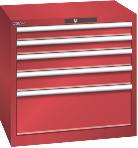 "longDescription": "LISTA Schubladenschrank, Lista Einheit: 36x27E, BxTxH: 717x572x700mm, Schubladen-Nutzfläche BxT: 612x459mm, Anzahl Schubladen: 5, Anzahl Fronthöhen (Tragkraft): 2x75mm (75kg), 2x100mm (75kg), 1x250mm (75kg), Schliessart: Code Lock, elektronisches Zahlenschloss mit 10 Ziffern für 4- bis 6-stellige Codes, bis 100 Codes, Farbe Gehäuse: Rubinrot RAL 3003, Farbe Schubladen: Rubinrot RAL 3003. Höchste Stabilität: Gehäuse bis 4t belastbar, Schubladen mit 75 oder 200 kg Tragkraft. Maximale Ausnutzung dank Vollauszug und optimaler Mantelhöhe der Schubladen. Exzellente Schutzeigenschaften gegen Schmutz, Flüssigkeiten und mechanische Beanspruchung durch geschlossenes Gehäuse mit schlag- und abriebfester Oberfläche. Überzeugende Sicherheit: Aushebesicherung gegen Herausfallen der Schubladen und Einzelschubladensperre als Kippschutz. Korrosionsschutz durch Elektrophorese-Tauchlackierung und umweltfreundlichen Pulverlack. Optimale Ordnung und Organisation dank speziellem LISTA-Einteilungsmaterial für jeden Zweck und gelochter, geschlitzter Schubladen. Professionelle Beschriftung mit Beschriftungssoftware LISTA Script und hochklappbarer Griffleiste zum Einlegen der Etiketten. Perfekte Laufruhe durch traversenlos geführten Differenzialauszug. Flexible Anpassungsmöglichkeiten durch vorperforierte Löcher für Tischplatten (Punchout), Rollen, Schubladen, Schliesssysteme für einfaches Um- und Nachrüsten<br>",